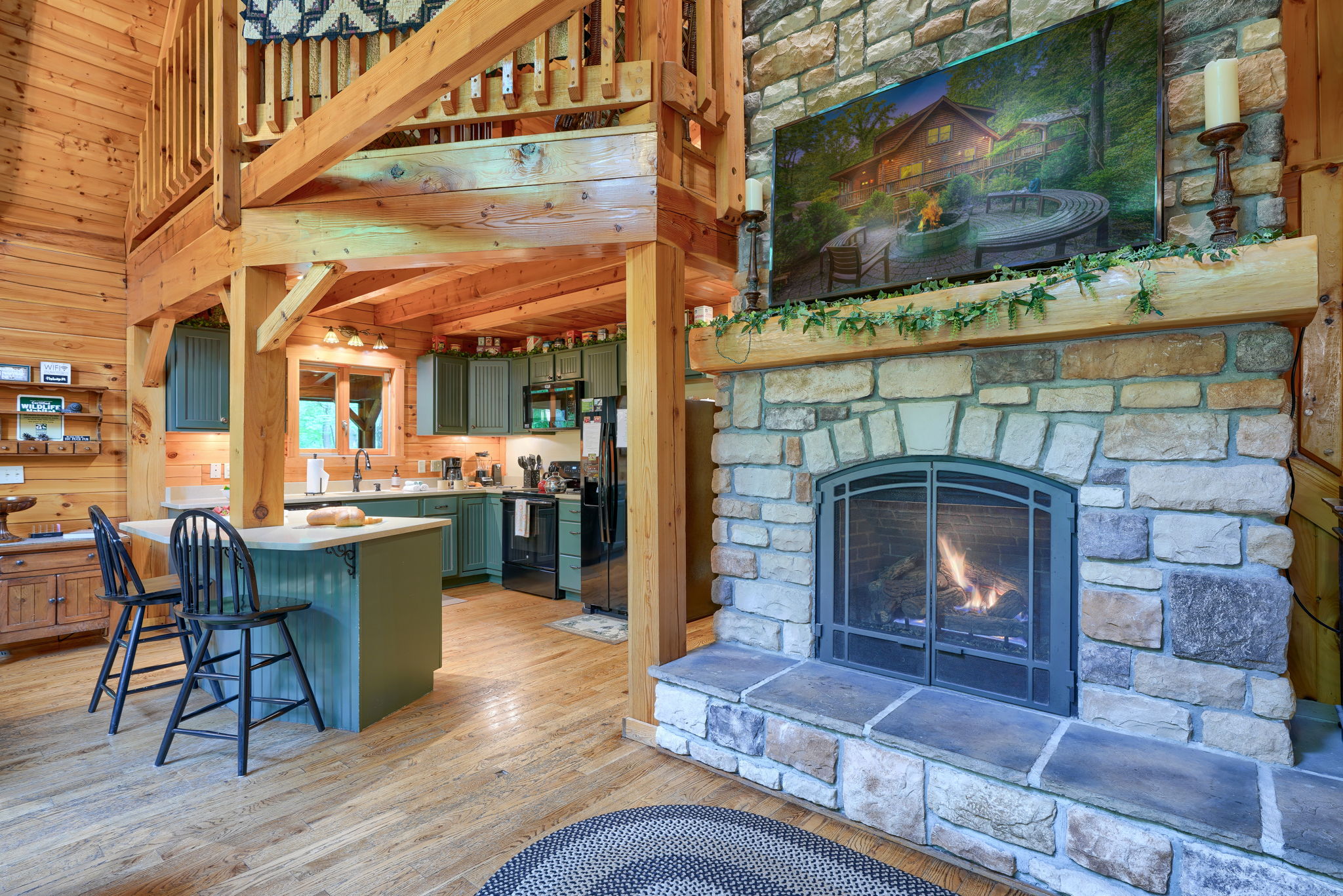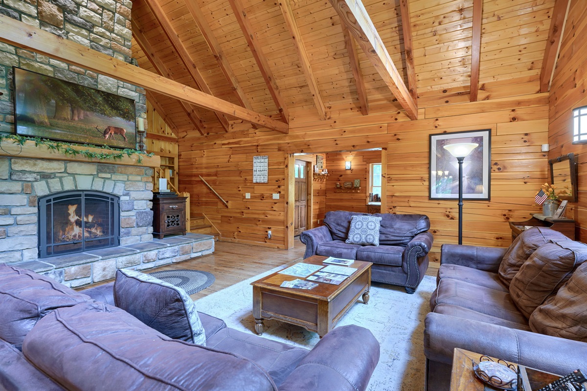 Step into this inviting lodge & immerse yourself in the spacious open-concept living room. The living room boasts a stunning stone gas fireplace, complemented by a smart TV mounted above it, offering the perfect setting for relaxation & entertainment.